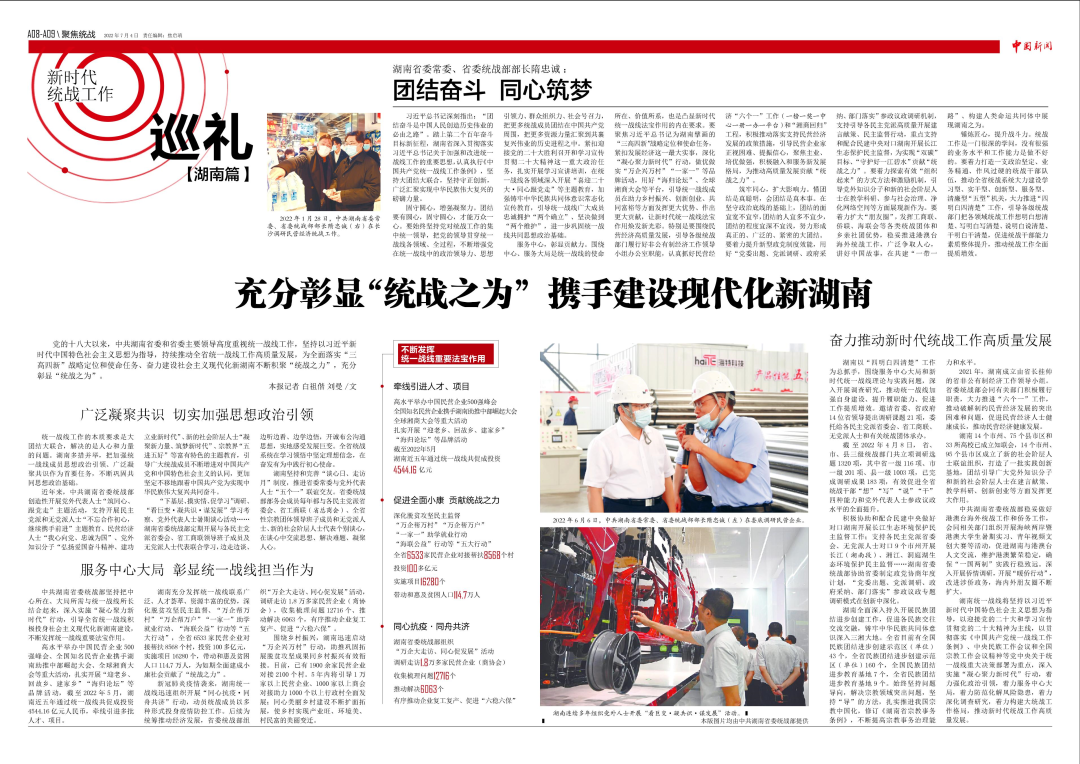 习近平总书记深刻指出:“团结奋斗是中国人民创造历史伟业的必由之路”。踏上第二个百年奋斗目标新征程,湖南省深入贯彻落实习近平总书记关于加强和改进统一战线工作的重要思想,认真执行《中国共产党统一战线工作条例》,坚持大团结大联合,坚持守正创新,广泛汇聚实现中华民族伟大复兴的磅礴力量。