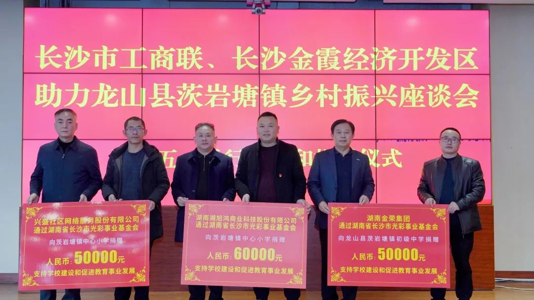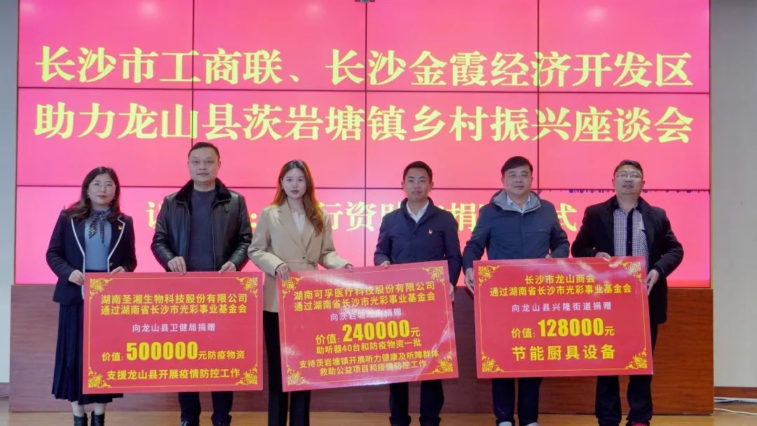 在1月10日召开的长沙市工商联、金霞经济开发区、省会民营企业家助力龙山县茨岩塘镇乡村振兴座谈会上,调研组一行观看了龙山宣传片,县领导进行了项目推介。在随后举行的资助和捐赠仪式上,长沙金霞经济开发区向茨岩塘镇政府资助产业发展资金50万元,长沙市工商联向茨岩塘镇政府资助产业发展资金30万元;圣湘生物向龙山县卫健局捐赠价值50万元的防疫物资;可孚医疗向茨岩塘镇政府捐赠价值24万元的助听器40台和一批防疫物资;长沙市龙山商会向龙山县兴隆街道捐赠价值12.8万元节能厨具;湖南湘旭鸿商业科技股份有限公司向茨岩塘镇中心小学捐款6万元,兴盛社区网络服务股份有限公司向茨岩塘镇中心小学捐款5万元,湖南金荣集团向龙山县茨岩塘镇初级中学捐款5万元,共计捐款捐物182.8万元。