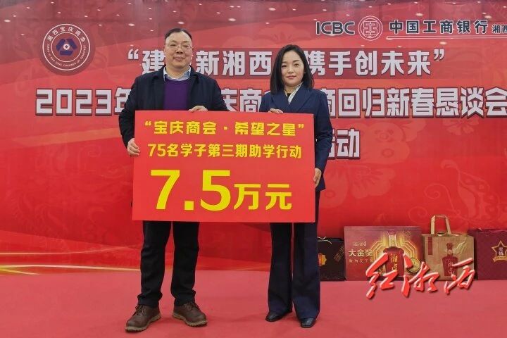 活动以“建设新湘西 携手创未来”为主题,湘西宝庆商会负责人对商会过去一年的工作进行了总结,代表商会为湘西学子捐赠助学金7.5万元,并表示商会将继续为湘西州经济社会发展贡献力量;中国工商银行湘西分行相关负责人对该行相关惠企金融产品进行了介绍;湘西高新技术产业开发区相关负责人作湘商回归招商引资推介,并邀请各位企业家前往湘西高新区考察投资、洽谈发展。